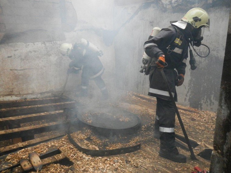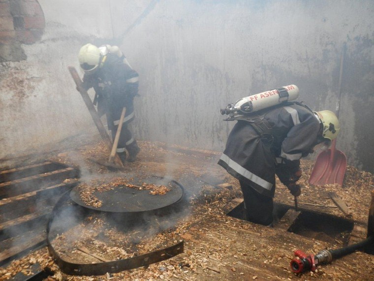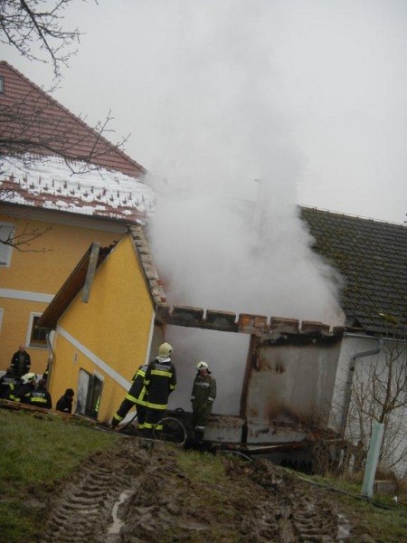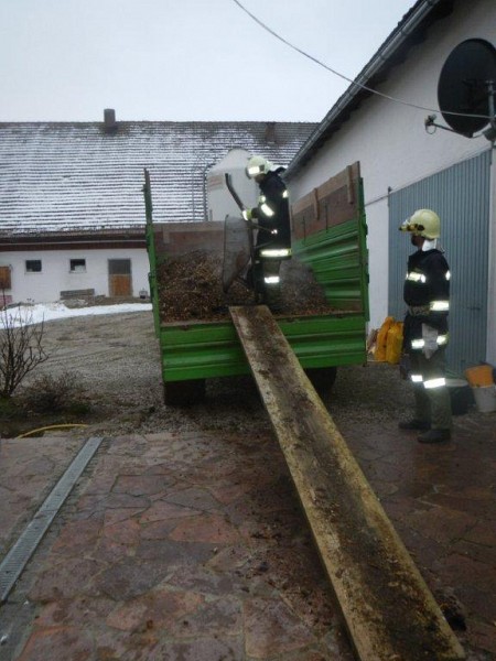 Unverzüglich wurde eine Zubringerleitung aufgebaut und mit dem Außenangriff begonnen. Um den Brandherd ablöschen zu können, musste dabei der ca. 40 m³ fassende Lagerraum händisch mit Schaufel und Schubkarren geräumt werden, unsere Feuerwehr stellte dabei 2 Atemschutz-Trupps.