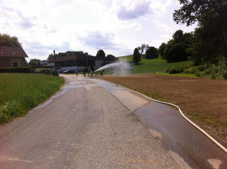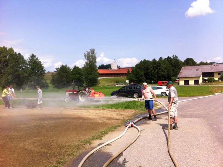 Durch die zahlreiche Hilfe unserer Mitglieder konnte der Übungsplatz nach der heurigen Bewerbssaison für Jugend- und Bewerbsgruppe wieder begradigt und neu angelegt werden. Zum Bewässern des neuen Rasens wurde eine Schlauchleitung von der Stelzerbrücke, wo angesaugt wurde, über die Eitzingerstraße zum Übungsplatz gelegt. Insgesamt wurden ca. 45.000 Liter für die Erstbewässerung benötigt. Nochmals Danke an die vielen Helfer für Eure Unterstützung