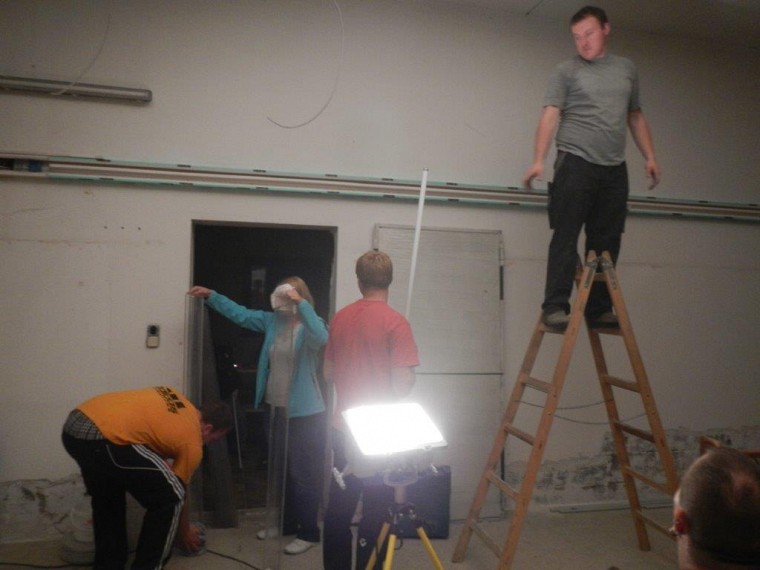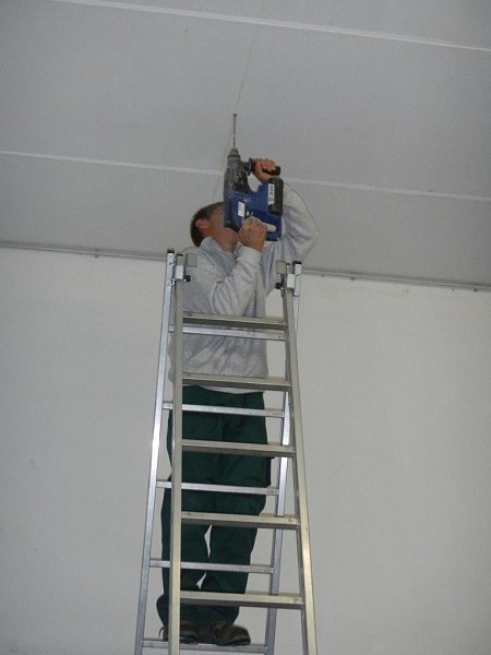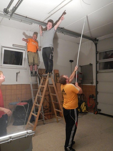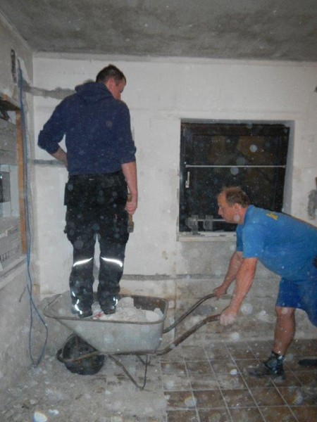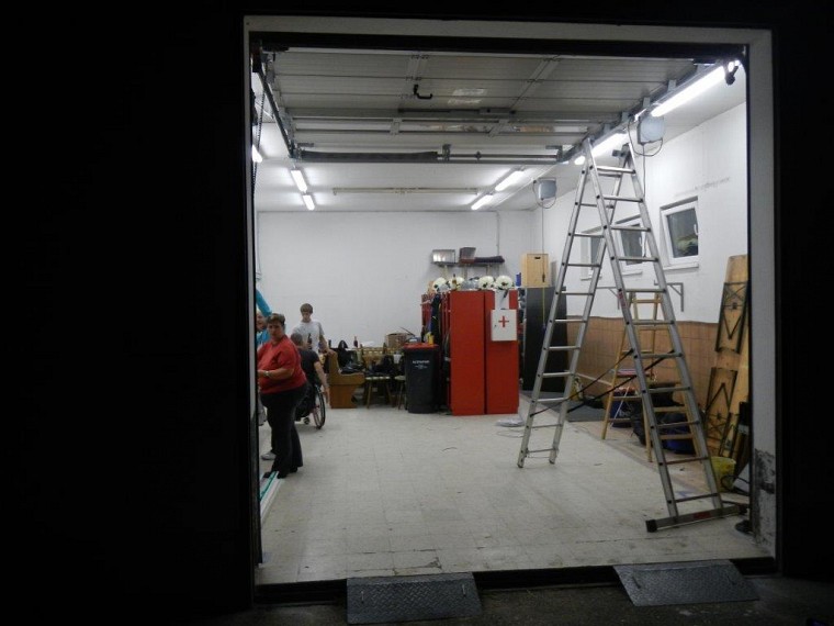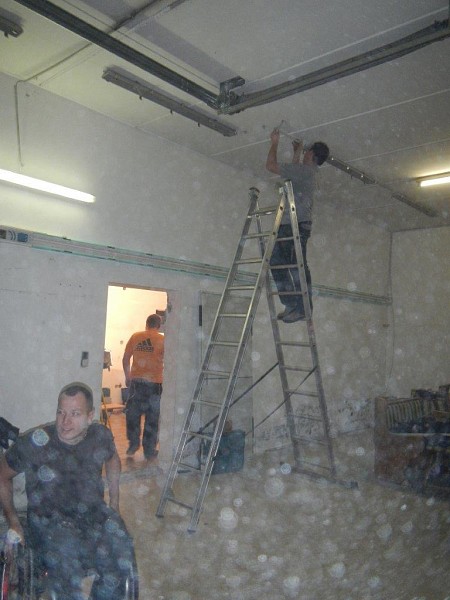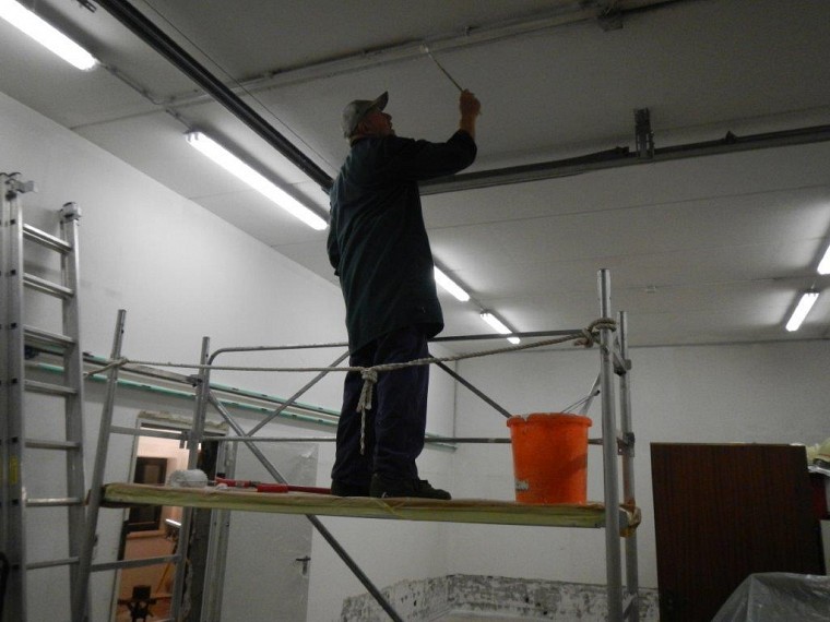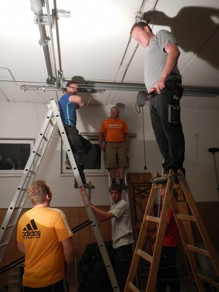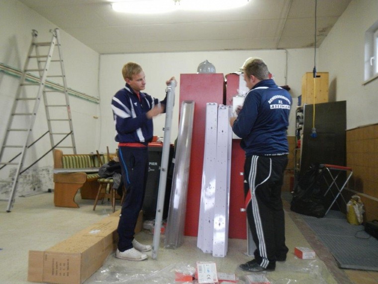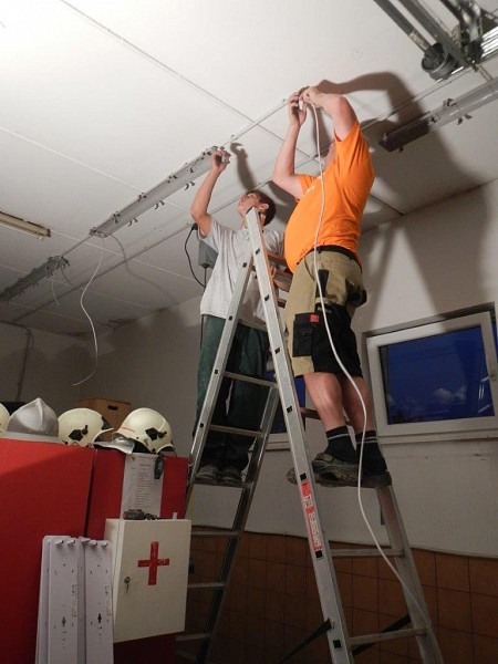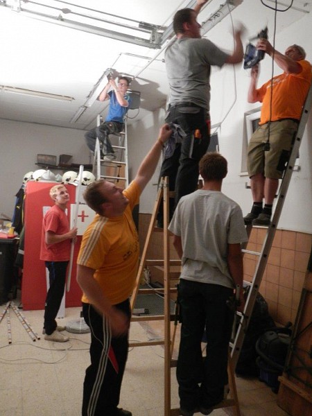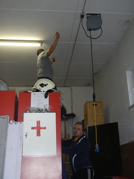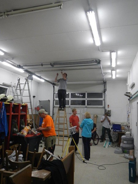 Nach dem Start mit Ausräumen und Stemmen wurde fleißig weitergearbeitet. In der Garage sind neue Lampen installiert worden und im Mannschafftsraum, der schon über eine neue Türe verfügt, schreitet die Elektroinstallation ebenfalls voran. Zuletzt haben wir mit dem Abschleifen der Türrahmen und dem Ausmalen der Fahrzeughalle und des Obergeschosses begonnen.
