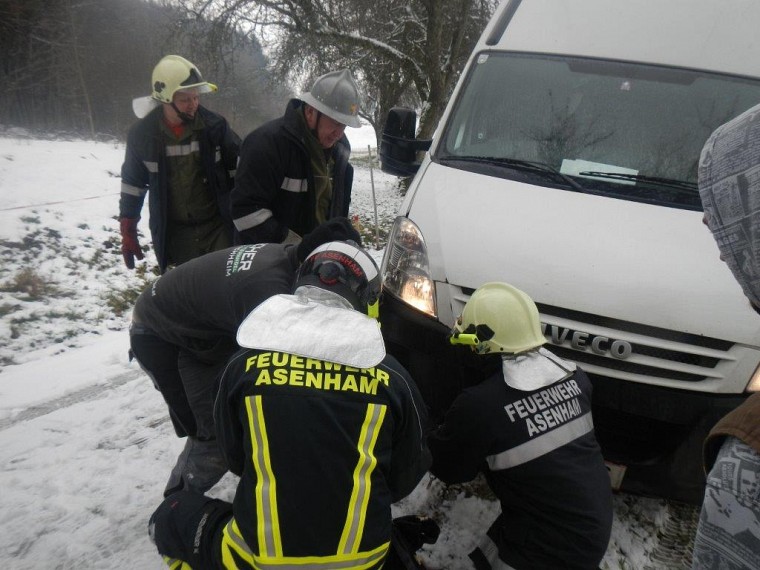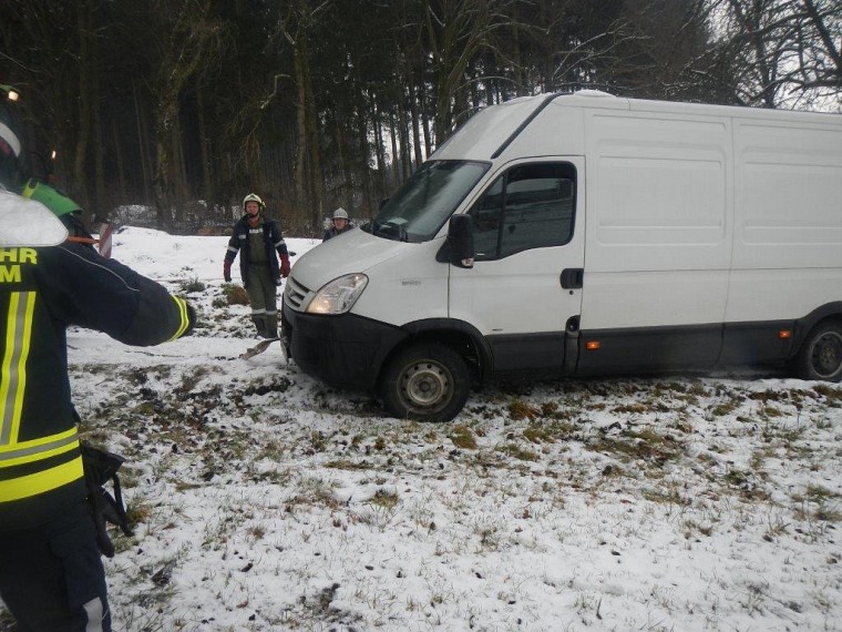 Aufgrund der rutschigen Straßenverhältnisse ist ein Lieferwagen von der Straße abgekommen und konnte sich selbst nicht mehr aus seiner Lage befreien.