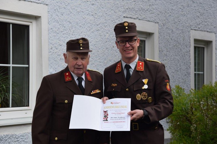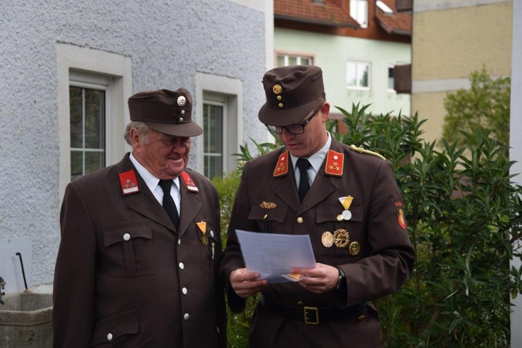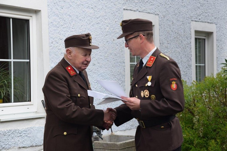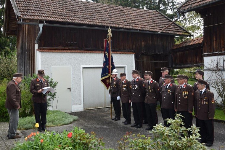 Die Kameraden unserer Feuerwehr versammelten sich nach dem Umzug vor seinem Haus zur Übergabe der Urkunde für 70jährige Mitgliedschaft.