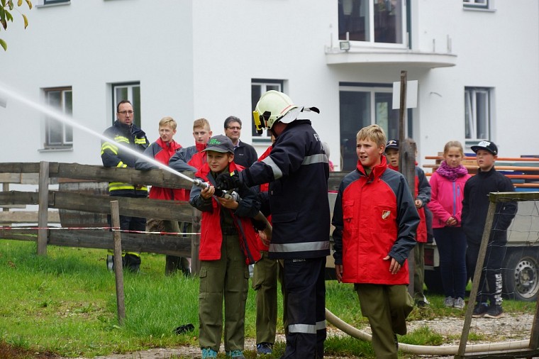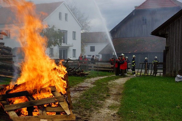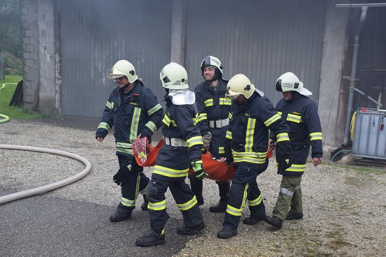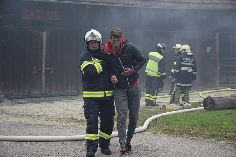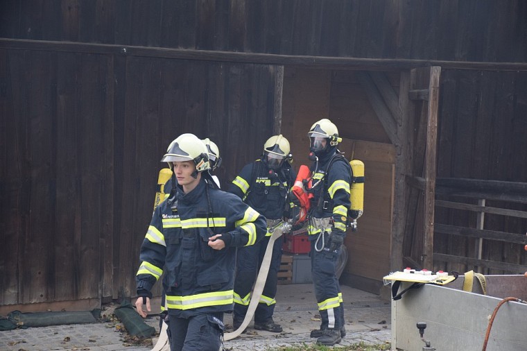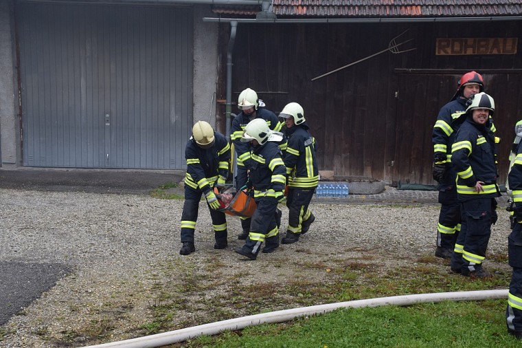 Unsere Feuerwehr rückte unverzüglich aus und war die erste Feuerwehr am Übungsobjekt. Noch während der Lageerkunding durch den Einsatzleiter wurde von der Mannschaft eine Zubringerleitung vom nahegelegenen Löschteich zum Brandherd gelegt, die Einsatzleitung und der Atemschutzsammelplatz errichtet. Unser Atemschutztrupp begab sich nach Errichten der Zubringerleitung unter Vornahme eines C-Strahlrohres in den Brandraum und begann mit der Rettung der vermissten Personen.