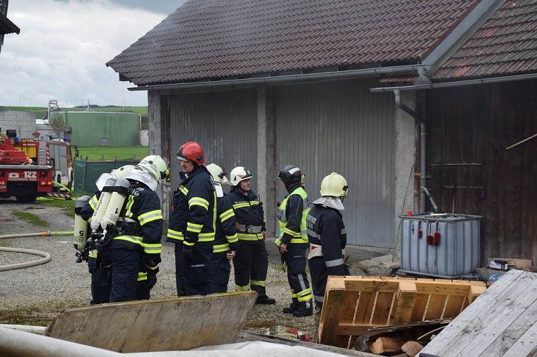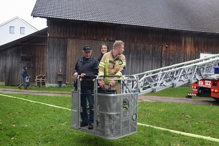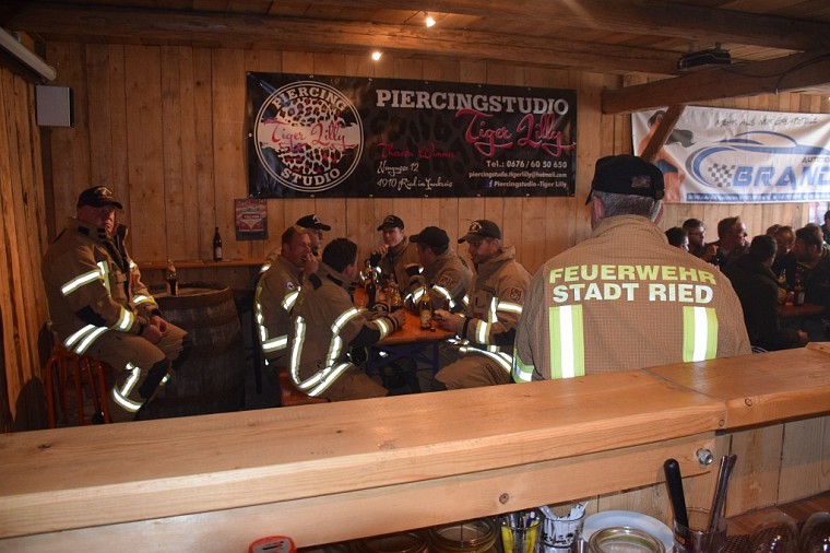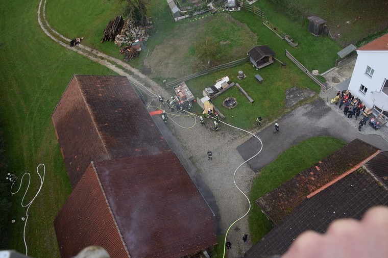 Kurze Zeit später trafen die nachalarmierten Feuerwehre ein, die FF Ried positionierte sich mit der Drehleiter und begann das angrenzende Wirtschaftsgebäude mit dem Wasserwerfer vor einem übergreifen der Flammen zu schützen.