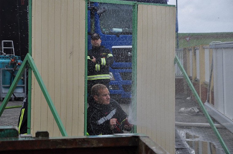 Um den Adrenalinspiegel im Körper der Teilnehmer auf Maximum zu steigern, wurde eine gewollte Rauchdurchzündung simuliert. Rasches Reagieren des Strahlrohrträgers war hier gefragt. Sprühstrahl und Mannschaftsdusche folgten als Reaktion auf die Feuerzungen an der Decke. Am Ende des Brandcontainers forderte der Brandherd ein minutenlanges Abgeben von Löschwasser, um eine möglichste hohe Dampfbildung im Inneren des Containers zu Erreichen.