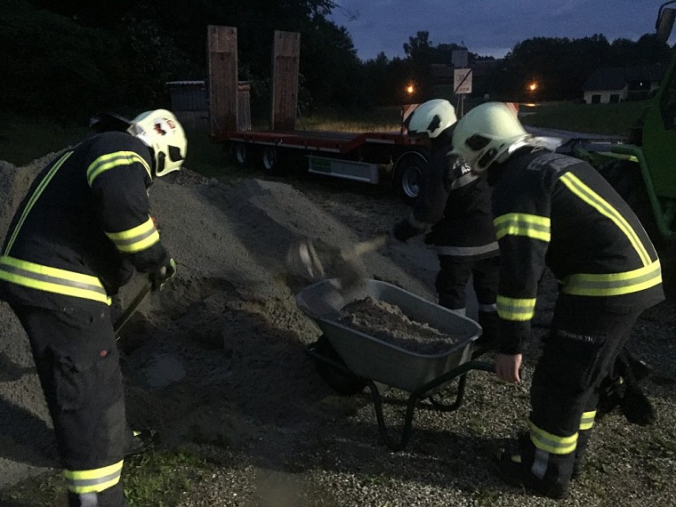 Im Zuge des Heißwasseranschlusses eines Wohnhauses wurden Löcher in die Kellerwand gebohrt, welche noch nicht vollständig abgedichtet worden waren. Infolge des Starkregens füllte sich das Erdloch, das Loch auf der anderen Straßenseite, sowie deren Verbindungstunnel. Es bestand somit die Gefahr einer Kellerüberflutung. Nach Auspumpen beider Löcher wurden die Bohrlöcher für die Heißwasserleitung provisorisch abgedichtet.