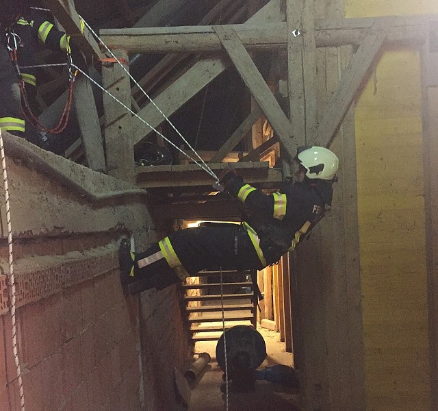Neben dem eigenen Abseilen stand das Sichern eines Kameraden mittels Seils und Klettergurt auf dem Programm. Ebenfalls wurde der Transport von verletzten Personen in der Korbschleiftrage über Höhenunterschiede erprobt.