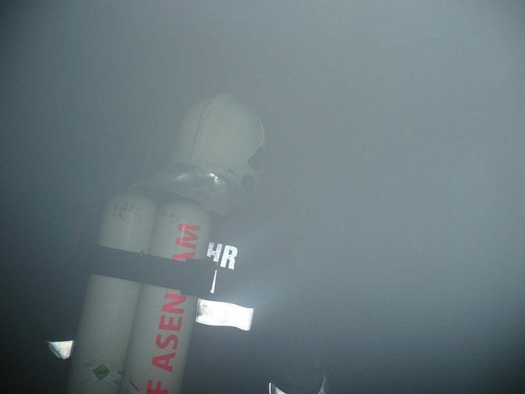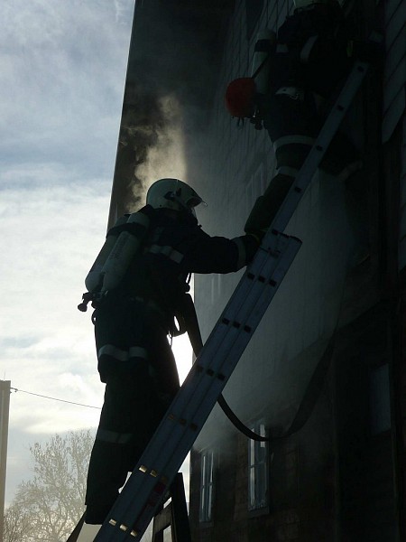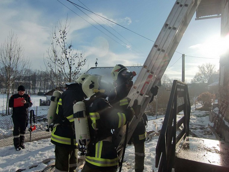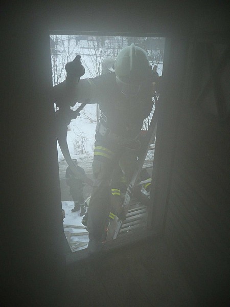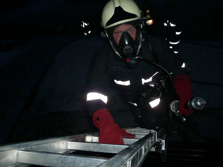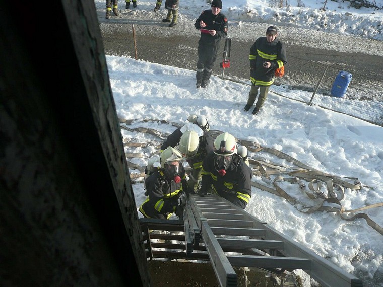 Die Übungsannahme war ein Brand im Erdgeschoss, wobei der Zugang zum Gebäude nur durch eine offene Tür im ersten Stock über eine Leiter möglich war. Jeder Trupp hatte die Aufgabe eine Babypuppe und einen unserer Kameraden, der ein Opfer darstellte, zu bergen und weiters natürlich den Brandherd ausfindig zu machen und diesen zu löschen. Nebenbei waren im Haus auch Kanister und Gasflaschen platziert, die sichergestellt werden mussten.