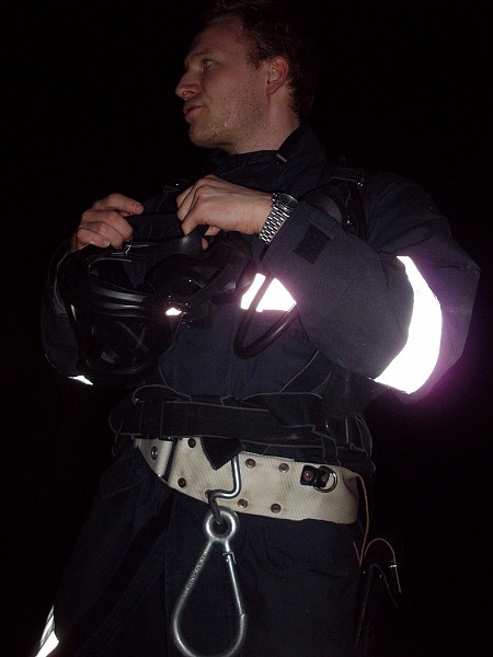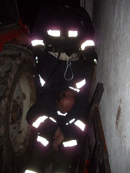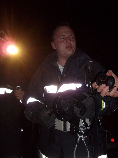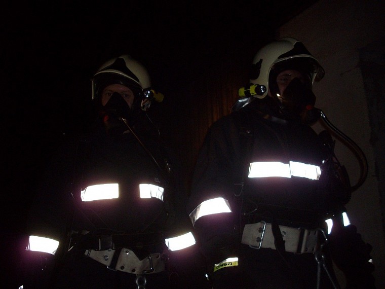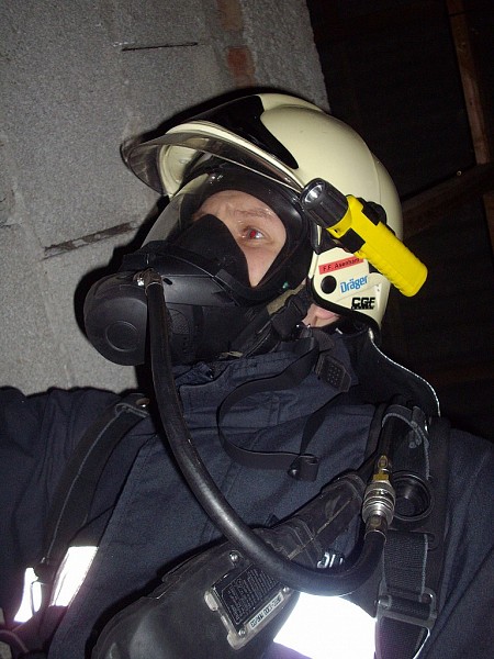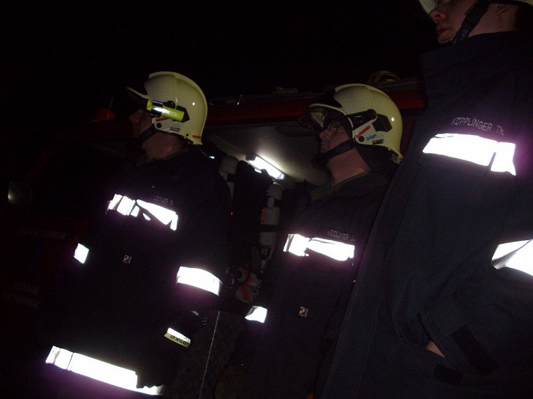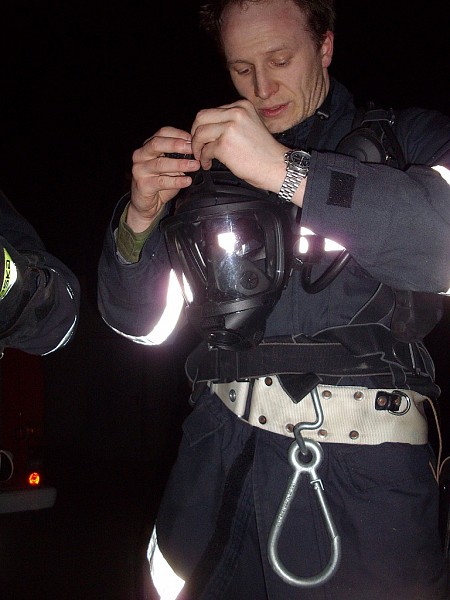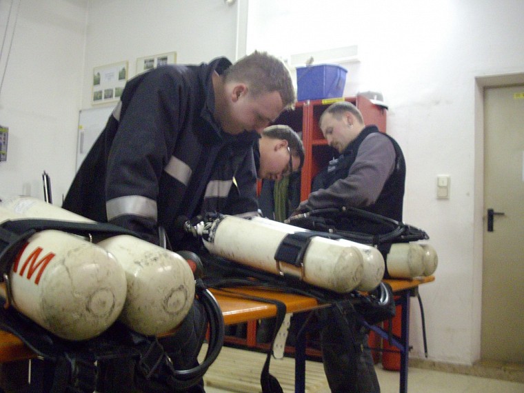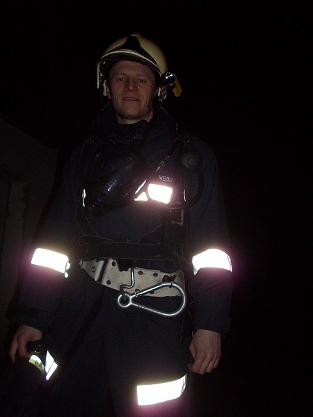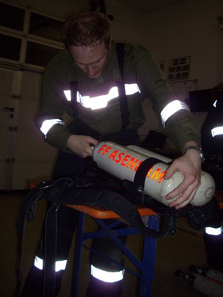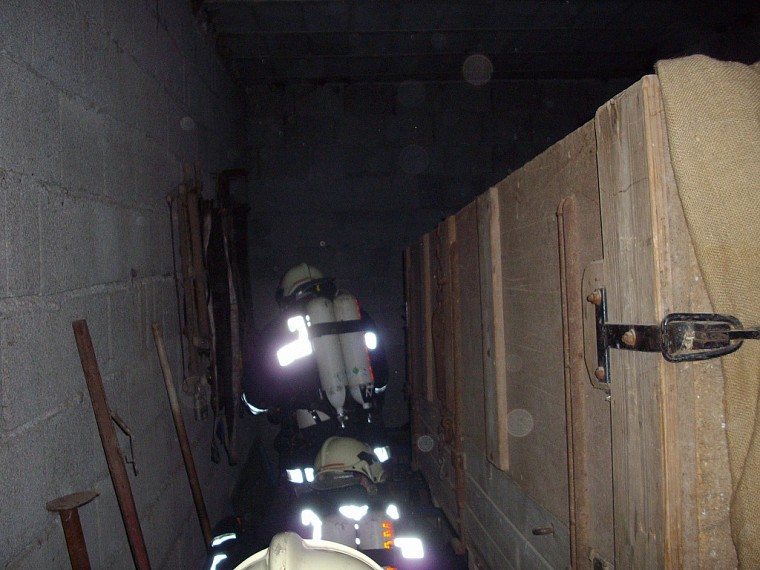 Übungsannahme war ein Brand in einer doppelstöckigen Garage. Neben der Brandbekämpfung mußten vom Atemschutztrupp eine verletzte Person und Gasflaschen aus dem Gefahrenbereich gebracht werden.