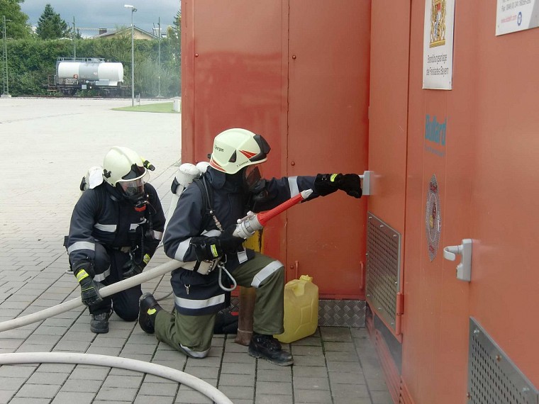 Nach dem richtigen Öffnen der Türe mussten die Kameraden verschiedene Brandherde (Fett-, Gasflaschen und Treppenhausbrand) löschen, weiters musste eine Person, die durch eine Puppe simuliert wurde, und 2 Schaummittelkanister geborgen werden. Starker Rauch und Sichtverhältnisse unter einem halben Meter erschwerten dies erheblich.