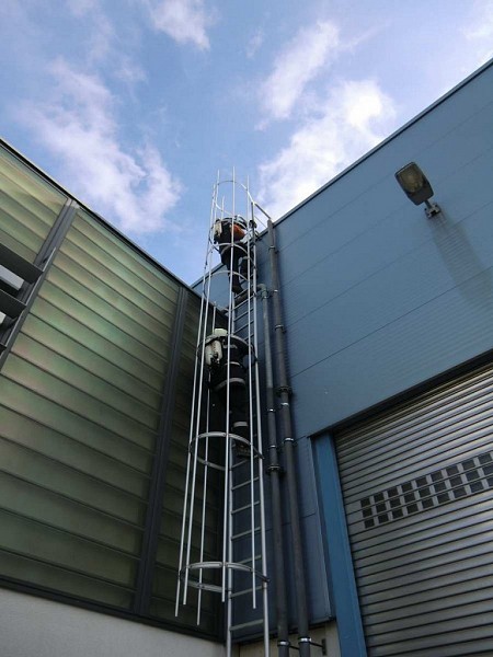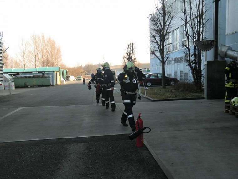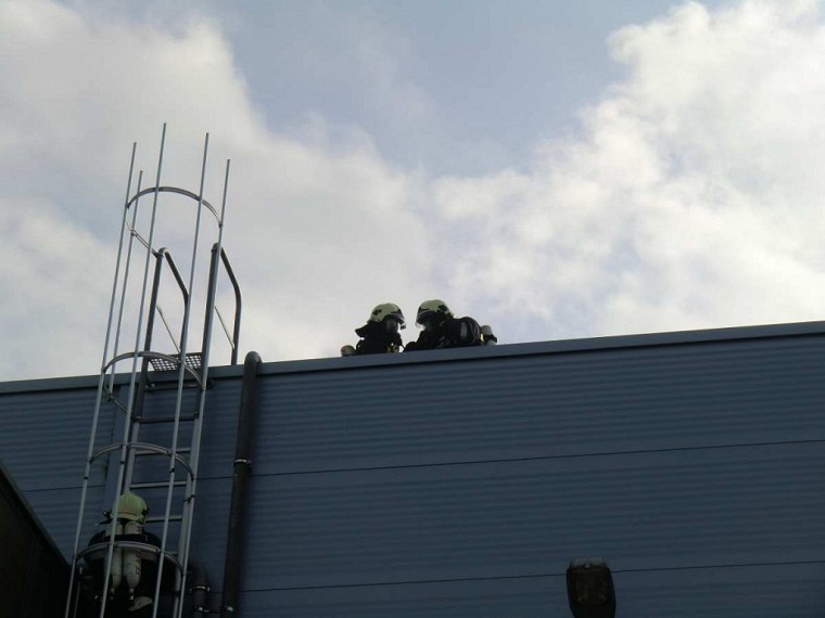Bei der ersten Station mussten die Atemschutztrupps das Dach der Produktionshalle überqueren, die Aufgabe wurde durch ein auf und ab über die Lichtkuppeln erheblich erschwert. Weiters musste in der Mitte der Halle ein Druckmanometer abgelesen und über Funk der Druck an die Übungsleitung durchgegeben werden.