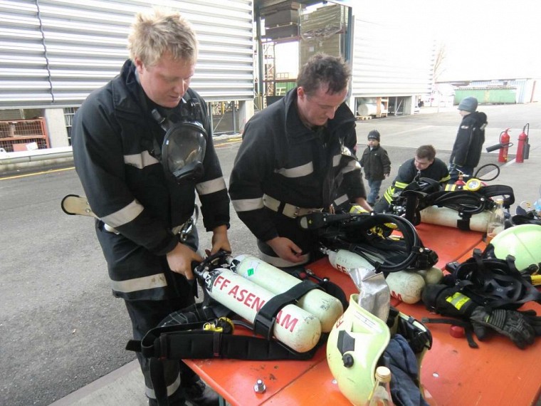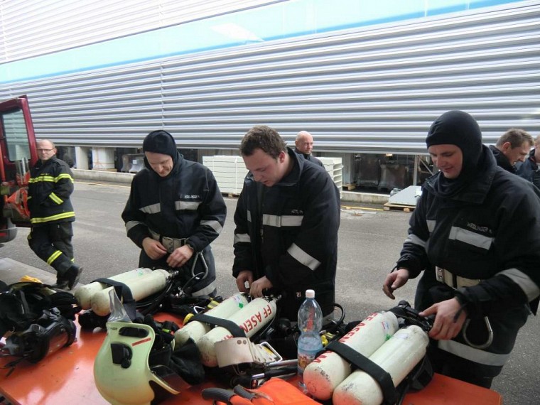 Nach einer kurzen Verschnaufpause und einem weiteren Flaschenwechsel ging es weiter zur dritten und letzten Station. Über den Fluchttunnel musste dieses Mal ein Löschangriff in den Trockenraum vorgenommen werden, als Erschwerung mussten aus der Trockenkammer bei einer Hitze von ca.120°C 6 Behälter geborgen und ins Freie gebracht werden.