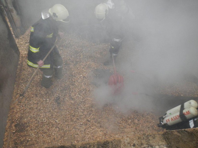 Unverzüglich wurde eine Zubringerleitung aufgebaut und mit dem Außenangriff begonnen. Um den Brandherd ablöschen zu können, musste dabei der ca. 40 m³ fassende Lagerraum händisch mit Schaufel und Schubkarren geräumt werden, unsere Feuerwehr stellte dabei 2 Atemschutz-Trupps.