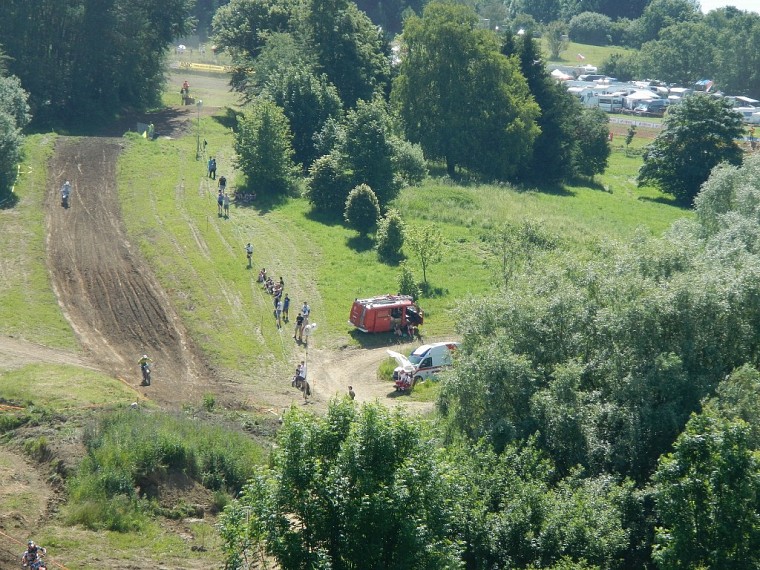 Bereits am Freitag begannen bei unserem Feuerwehrhaus die Aufbauarbeiten. Es mussten vor allem wieder die Schläuche zum Bewässern der Bahnen verlegt werden. Da der Wetterbericht strahlenden Sonnenschein versprach, war das Bahnspritzen zur Unterdrückung der Staubentwicklung besonders wichtig. Es rollten auch schon die ersten Campingbusse der Rennteams an, die auf den Park- bzw. Campingplatz gelotst werden mussten.