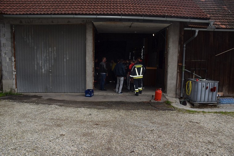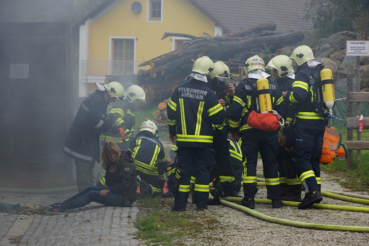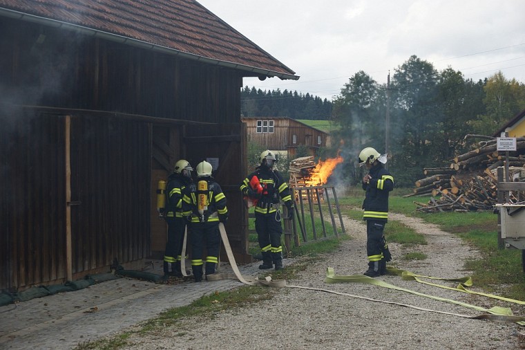 Unsere Feuerwehr rückte unverzüglich aus und war die erste Feuerwehr am Übungsobjekt. Noch während der Lageerkunding durch den Einsatzleiter wurde von der Mannschaft eine Zubringerleitung vom nahegelegenen Löschteich zum Brandherd gelegt, die Einsatzleitung und der Atemschutzsammelplatz errichtet. Unser Atemschutztrupp begab sich nach Errichten der Zubringerleitung unter Vornahme eines C-Strahlrohres in den Brandraum und begann mit der Rettung der vermissten Personen.