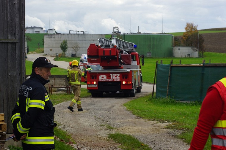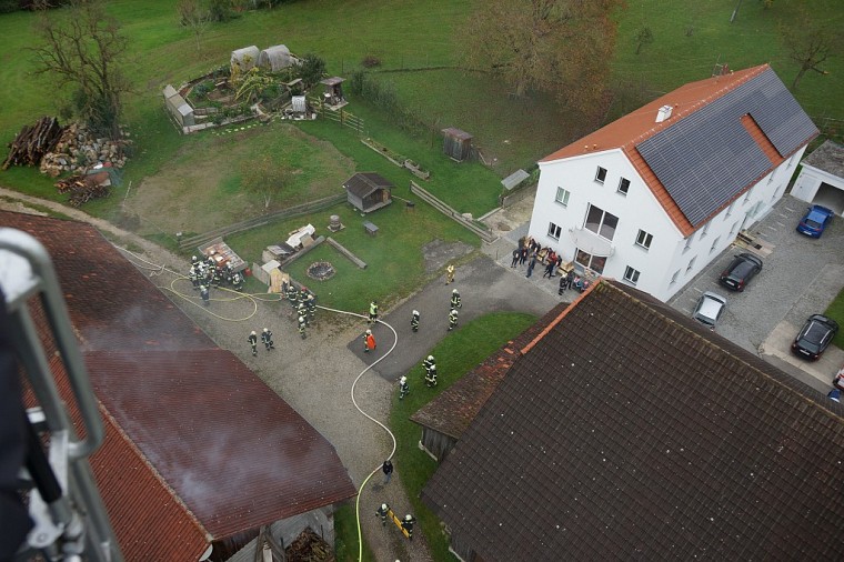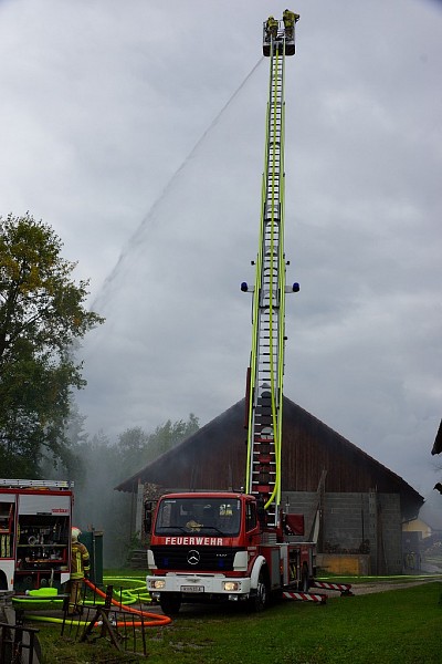 Kurze Zeit später trafen die nachalarmierten Feuerwehre ein, die FF Ried positionierte sich mit der Drehleiter und begann das angrenzende Wirtschaftsgebäude mit dem Wasserwerfer vor einem übergreifen der Flammen zu schützen.
