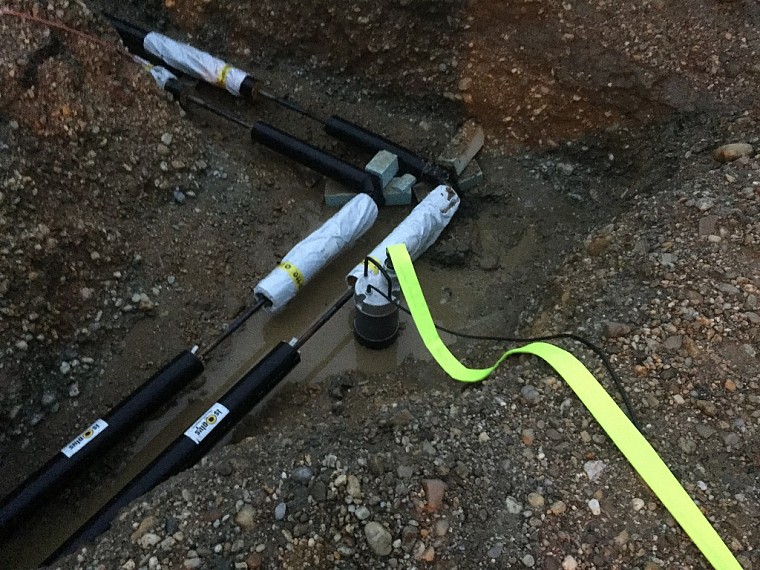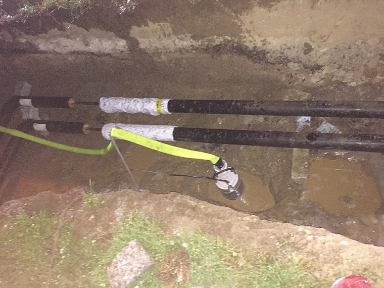 Im Zuge des Heißwasseranschlusses eines Wohnhauses wurden Löcher in die Kellerwand gebohrt, welche noch nicht vollständig abgedichtet worden waren. Infolge des Starkregens füllte sich das Erdloch, das Loch auf der anderen Straßenseite, sowie deren Verbindungstunnel. Es bestand somit die Gefahr einer Kellerüberflutung. Nach Auspumpen beider Löcher wurden die Bohrlöcher für die Heißwasserleitung provisorisch abgedichtet.