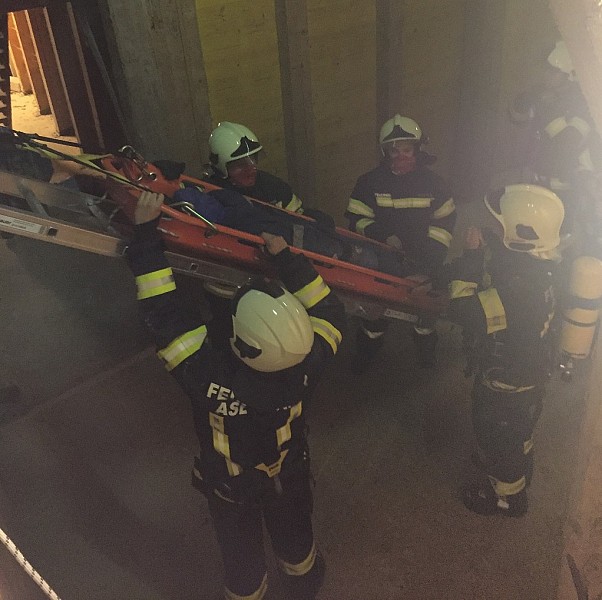 Neben dem eigenen Abseilen stand das Sichern eines Kameraden mittels Seils und Klettergurt auf dem Programm. Ebenfalls wurde der Transport von verletzten Personen in der Korbschleiftrage über Höhenunterschiede erprobt.