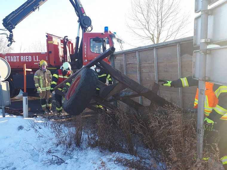 Mittels Ladekrans des Wechselladefahrzeuges der FF Ried konnte die Bergung durchgeführt werden.