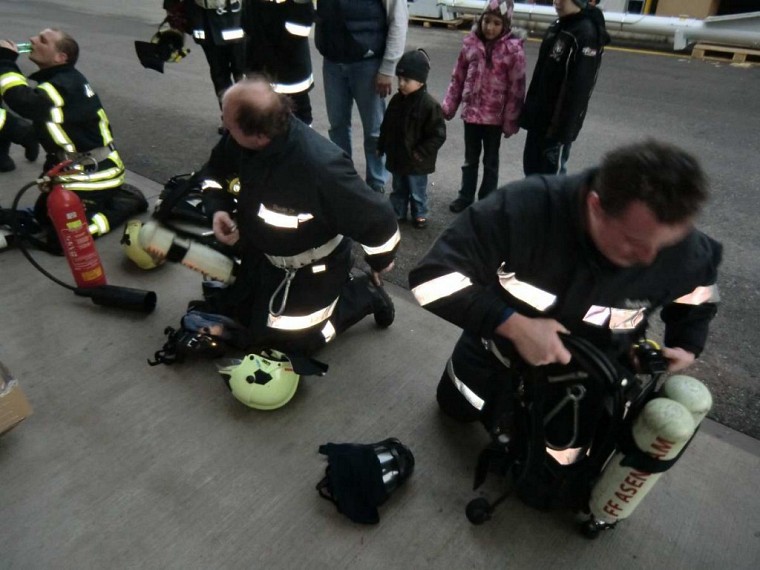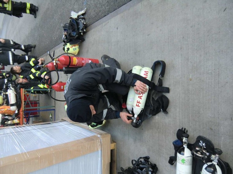 Nach einer kurzen Verschnaufpause und einem weiteren Flaschenwechsel ging es weiter zur dritten und letzten Station. Über den Fluchttunnel musste dieses Mal ein Löschangriff in den Trockenraum vorgenommen werden, als Erschwerung mussten aus der Trockenkammer bei einer Hitze von ca.120°C 6 Behälter geborgen und ins Freie gebracht werden.